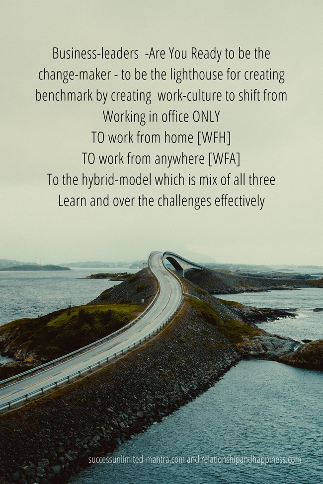 There is a definite shift of work-culture from working in office ONLY TO work from home [WFH] TO work from anywhere [WFA] and the hybrid-model which is mix of all three is happening in many businesses and professions.