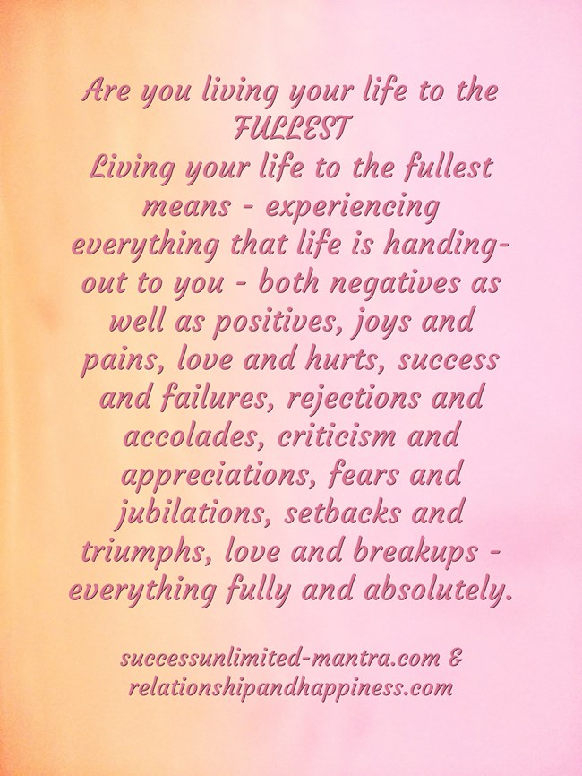 Living your life to the fullest means - experiencing everything that life is handing-out to you - both negatives as well as positives, joys and pains, love and hurts, success and failures, rejections and accolades, criticism and appreciations, fears and jubilations, setbacks and triumphs, love and breakups - everything fully and absolutely.