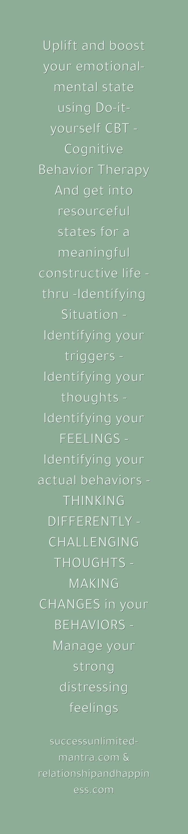 -60+ Tips on how to Uplift and boost your emotional-mental state using Do-it-yourself CBT - Cognitive Behavior Therapy And get into resourceful states for a meaningful constructive life - thru -Identifying Situation - Identifying your triggers - Identifying your thoughts - Identifying your FEELINGS - Identifying your actual behaviors - THINKING DIFFERENTLY -CHALLENGING THOUGHTS - MAKING CHANGES in your BEHAVIORS - Manage your strong distressing feelings