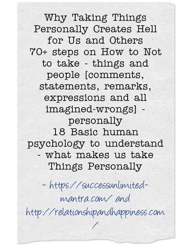 Learning - how not to take things [comments, statements, remarks, expressions and all imagined-wrongs]- personally - is a skill that can help each one of us avoid many hurts, anger, disappointments and hear-breaks, misunderstandings, quarrels, negativities, conflicts, disputes, stress etc.